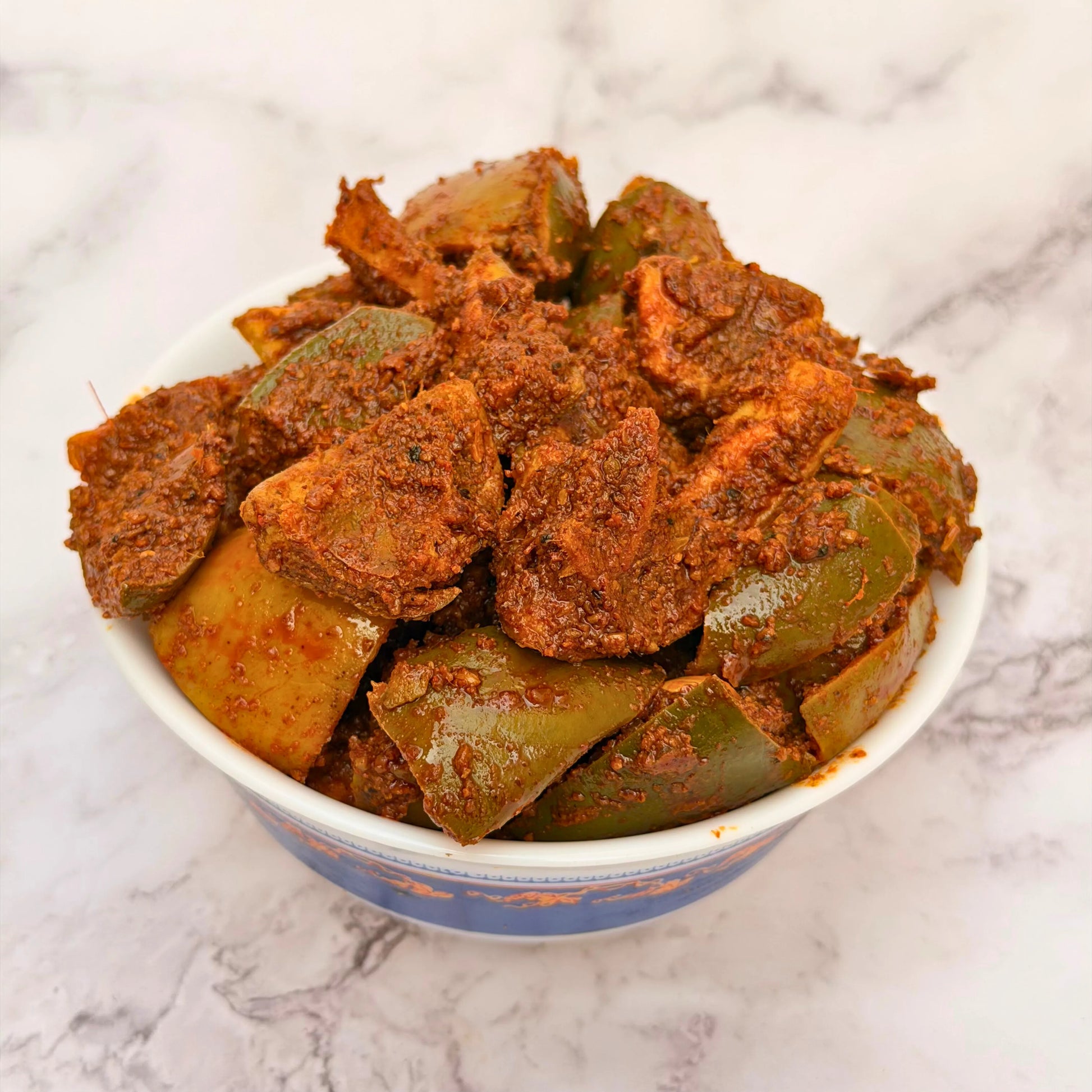 Prepared in small batches using age-old recipes, this juicy pickle is a perfect balance of sour mango, fiery spices, and rich oil – matured naturally for weeks to develop its deep, mouth-watering taste.