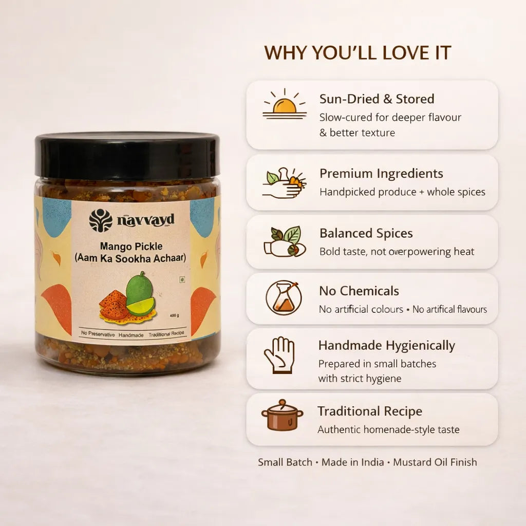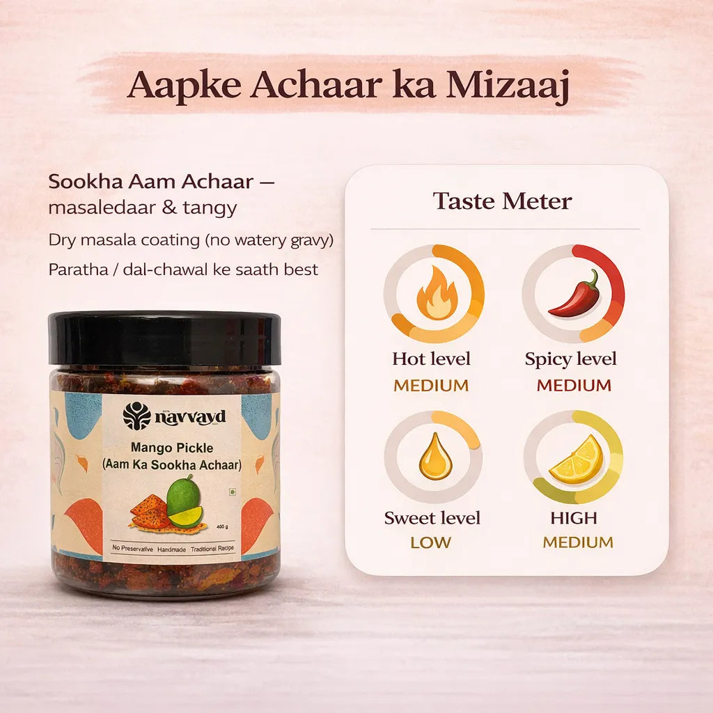 Relish the irresistible taste of tradition with our Aam ka Sookha Achaar, made from farm-fresh raw mangoes and a secret blend of spices slow-cooked in mustard oil. This is the mango pickle every Indian household knows and loves – bold, tangy, and bursting with flavour.