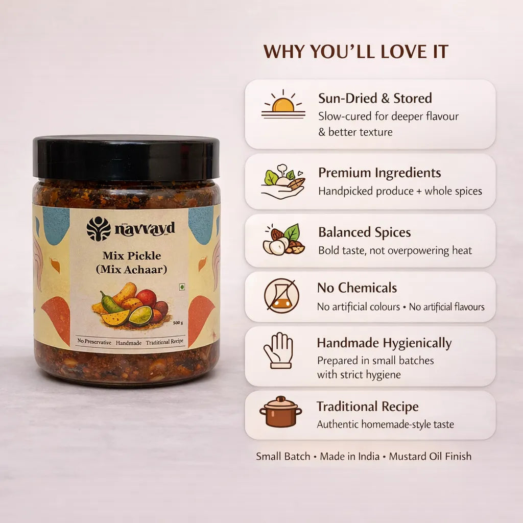 Why choose one when you can have it all? Our Mixed Achaar is a delicious blend of hand-cut vegetables and fruits like raw mango, carrot, lemon, green chillies, ginger, and more — all tossed in a bold mix of home-roasted Indian spices and aged in mustard oil.