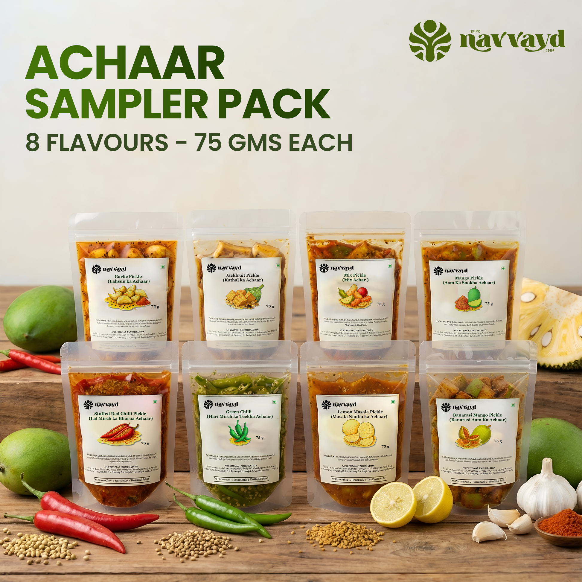 If you love achaar but don’t want to commit to just one flavour, this box is made for you. The Navvayd 8-Flavour Achaar Combo Box brings together eight unique pickles in convenient 75g mini packs—so you can enjoy variety every day, discover your favourites, and keep your meals exciting without any wastage. Whether you’re pairing it with paratha in the morning, dal-chawal at lunch, or khichdi at dinner, this combo adds that perfect desi punch—tangy, spicy, and full of traditional taste.