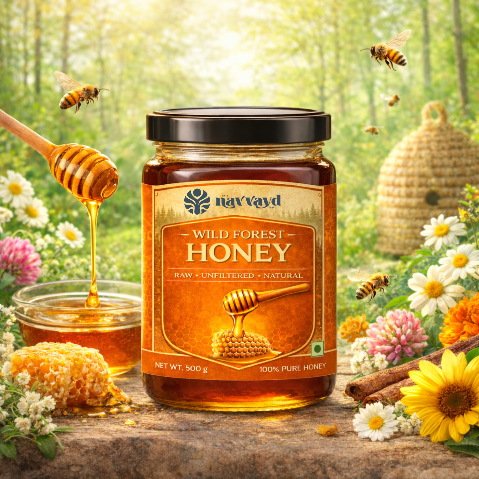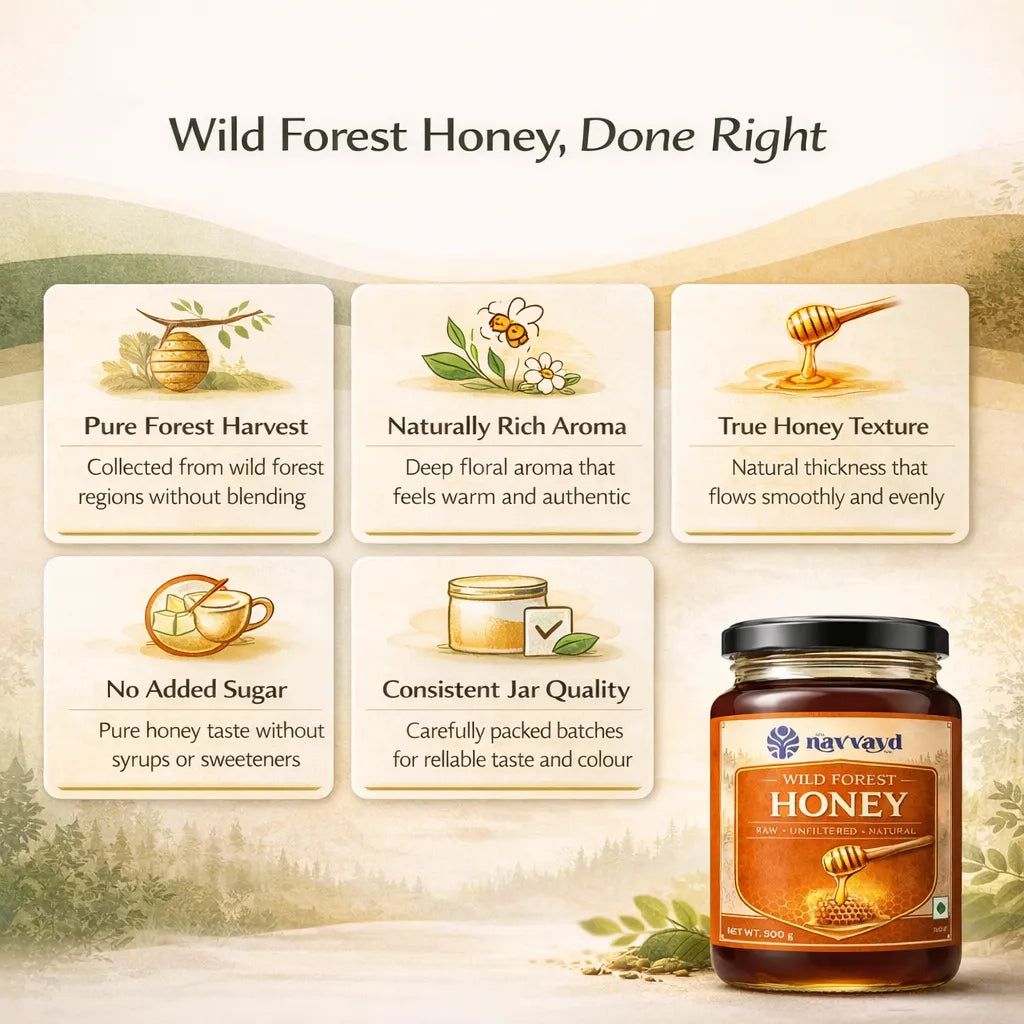 Straight from the heart of untouched Indian forests, our Wild Forest Honey is harvested by traditional foragers from the nectar of wildflowers and medicinal plants. It’s raw, unprocessed, and unheated — preserving every drop’s natural enzymes, antioxidants, and immunity-boosting benefits.